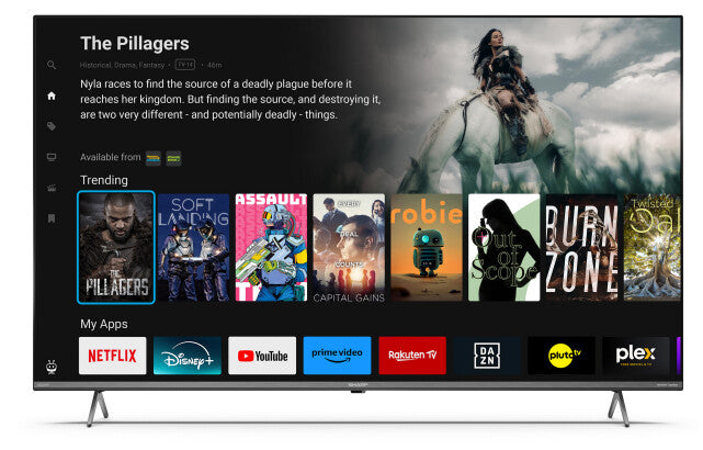 4K Ultra HD Powered by TiVo™ Smart TV. Voice Control: Easily find exactly what you want to watch. TiVo+: 160+ Free channels, live and on demand. HDMI 2.1 with eARC. Dolby Vision™: cinema-inspired HDR. Dolby Atmos®: full 360° sound experience. HARMAN/KARDON® Speaker System. AV1 codec for the highest streaming picture quality. Bluetooth. Display. Display diagonal (metric). 108 cm. Contrast ratio (dynamic). 1000000:1. Motion interpolation technology. Active Motion 400. Native refresh rate. 60 Hz. Screen shape. Flat. LED backlight. Yes. Display resolution. 3840 x 2160 pixels. HD type. 4K Ultra HD. Display diagonal. 109.2 cm (43"). TV tuner. Digital signal format system. DVB-C, DVB-S, DVB-S2, DVB-T, DVB-T2. Analog signal format system. PAL, SECAM. Tuner type. Analog & digital. Smart TV. Video apps. Amazon Prime Video, Disney+, Netflix, YouTube. Hybrid Broadcast Broadband TV (HbbTV) version. 2.0.3. Hybrid Broadcast Broadband TV (HbbTV). Yes. Operating system version. AI OS. Internet TV. Yes. Smart TV. Yes. Audio. Equalizer. Yes. Audio decoders. Dolby Atmos, Dolby Digital, Dolby Digital Plus. RMS rated power. 12 W. Number of speakers. 2. Network. Ethernet LAN. Yes. Bluetooth. Yes. Wi-Fi. Yes. Design. Panel mounting interface. 300 x 300 mm. VESA mounting. Yes. Product colour. Black. Performance. Audio formats supported. AAC, AC3, DTS, EAC3, FLAC, LPCM, M4A, MP3, WAV. Image formats supported. BMP, GIF, JPEG, JPG, MPO, PNG. Video formats supported. 3GP, 3GPP, ASF, AVI, DAT, FLV, MKV, MOV, MP4, MPEG, MPG, TP, TRP, TS, VOB, WEBM. High Dynamic Range (HDR) technology. Dolby Vision, High Dynamic Range 10 (HDR10), Hybrid Log-Gamma (HLG). High Dynamic Range (HDR) supported. Yes. Ports & interfaces. Headphone outputs. 1. Digital audio optical out. 1. USB 2.0 ports quantity. 2. Ethernet LAN (RJ-45) ports. 1. HDMI version. 2.1. HDMI ports quantity. 3. Power. AC input frequency. 50/60 Hz. AC input voltage. 220 - 240 V. Energy efficiency class (SDR). F. Power consumption (standby). 0.5 W. Power consumption (typical). 45 W. Weight & dimensions. Weight (without stand). 7.4 kg. Height (without stand). 575 mm. Depth (without stand). 82 mm. Width (without stand). 957 mm. Height (with stand). 619 mm. Depth (with stand). 230 mm. Width (with stand). 957 mm. Packaging data. Package weight. 9.7 kg. Package height. 640 mm. Package depth. 130 mm. Package width. 1070 mm. Quick start guide. Yes. Packaging content. Remote control included. Yes. TV frame included. Yes. Other features. Number of batteries supported. 2. Battery type. AA,AAA. Batteries included. Yes. leaflet