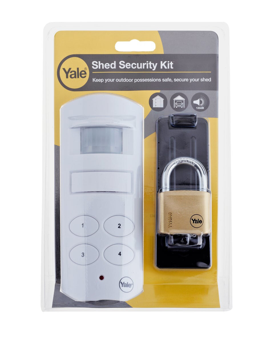 Motion Detection - Alarm will sound 10 seconds after motion is detected if 4 digit PIN code is not entered. You can set your own PIN code. Range - 12m detection range suitable for protecting sheds, garages, outbuildings and caravans. Loud Siren - 100dB siren, loud enough to alert you when motion is detected. Low Battery Indicator - Red light warns you when batteries are running low. Easy to install - The alarm can be wall-mounted or freestanding. Padlock - tested up to 96 hours for corrosion resistance to ensure protection against different weather conditions. The Yale Shed and Garage Alarm with Padlock and Hasp is the ideal way to secure buildings outside of the main home. It is simple to install, can be wall-mounted or be freestanding. The Yale Shed and Garage Alarm is standalone wire free and battery operated alarm so there is no need to run any cables. A great wireless security solution for sheds, garages, outbuildings and caravans.. With 180 years of manufacturing expertise, an exclusive Yale design and rigorous testing, the Yale Brass Padlocks have been built with you in mind. Suitable for your gym locker, securing your DIY tools in your tool box or any belonging you want to keep safe and secure indoors.. Features. Control type. Buttons. Product colour. Black, Brass, White. Performance. Alarm decibels. 100 dB. Alarm detection. Yes. Detection distance. 12 m. Number of simultaneously connected devices (max). 1. Power. Autonomy mode. Yes. Connectivity technology. Wireless. Packaging content. Number of motion sensors. 1 pc(s)
