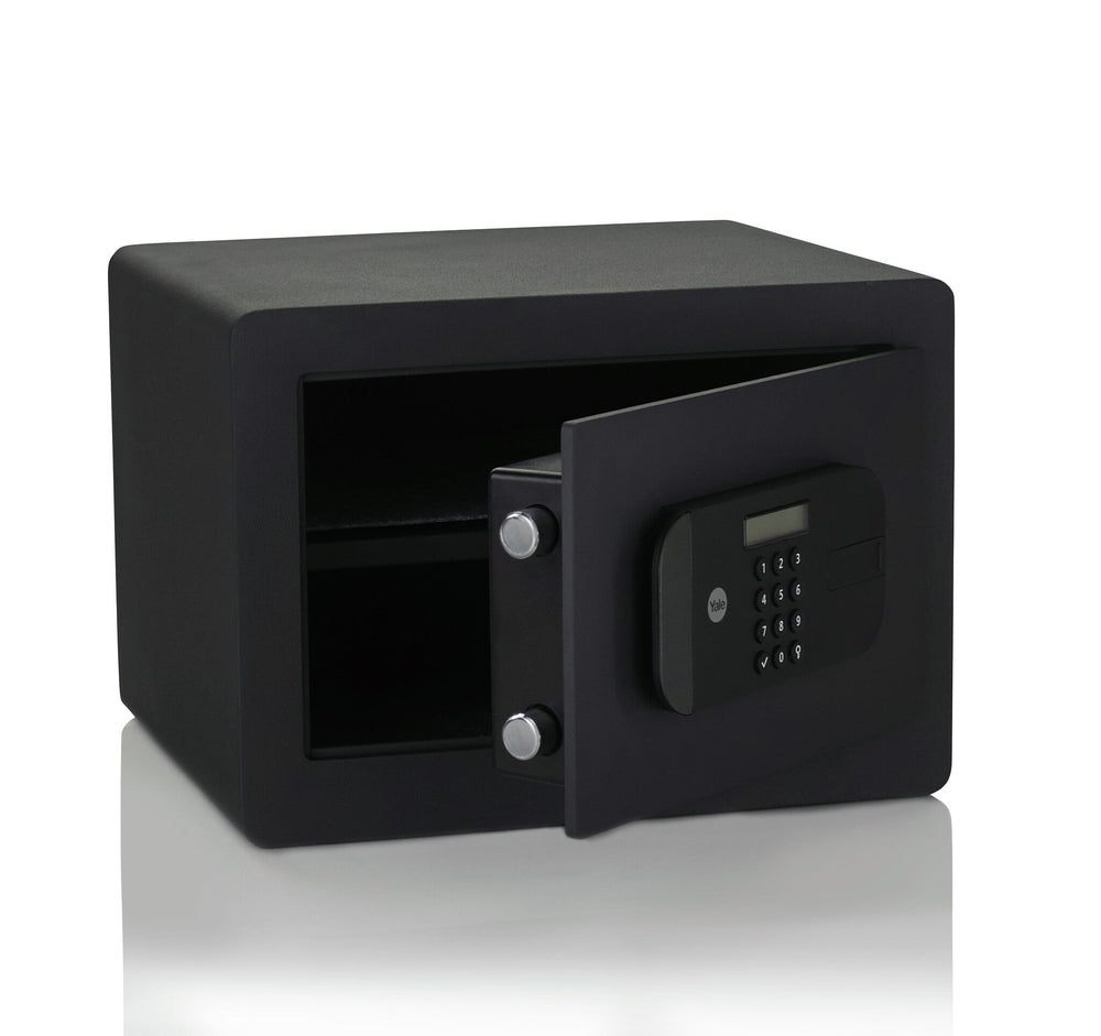 Laser cut door for protection against all forms of attack. Automatic door opening mechanism. High security motorised lock. Lock down for one minute after three incorrect attempts. Clear LCD keypad display. Internal light so contents can easily be seen. Internal hooks for hanging keys or small items. External 9v terminal (if internal batteries are dead, safe can be opened). Batteries Included. Features. Interior light. Yes. Built-in display. Yes. Lock type. Code. Locking. Yes. Product colour. Black. Capacity. 20.5 L. Power. Power source type. Battery. Weight & dimensions. Weight. 12.1 kg. Interior dimensions (W x D x H). 345 x 245 x 242 mm. Height. 250 mm. Depth. 300 mm. Width. 350 mm. Packaging data. Package weight. 13.1 kg. Package height. 290 mm. Package depth. 365 mm. Package width. 380 mm. Packaging content. Battery included. Yes. Logistics data. Country of origin. China. Commodity code. 8303009000
