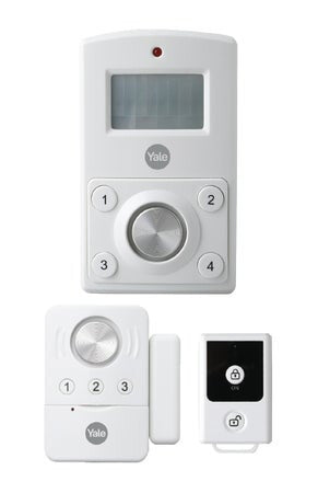 8m wire-free range to protect your shed, garage and outbuildings. Battery powered 130db siren which alerts upon motion detection. Comes with remote fob and door contact. Mini Wireless Alarm Kit. The Yale Mini Wireless Alarm Kit is the ideal way to secure buildings outside of the main home. The kit features the ability to detect suspicious movements via the PIR motion detector from up to 8 metres away, allowing you to secure your shed, garage and other outbuildings. The alarm features a loud, 130dB siren which will sound when motion is detected.. This standalone alarm kit is easy to set up and wire-free, eliminating the need to run any cables through your home or garden. Powered by a battery with an 18-month lifespan, the low battery indicator makes it clear when you are low on power, so you can be reassured your outbuilding remains protected. The Mini Wireless Alarm Kit includes the ability for you to set your own 4-digit PIN code, as well as a door contact that provides immediate perimeter notification of intruders and a key fob for arming/disarming the alarm up to 70 metres away. The kit can be used with or without the door contact and key fob – the PIN code on the main unit can be used instead of the fob.. Secure your buildings outside. Simple to install, both wall-mounted and freestanding. Passive infrared technology detects motion up to 8 metres away, triggering a 130db built-in siren.. Features. Installation type. Adhesive tape. Maximum outdoor range. 70 m. Product colour. White. Alarm decibels. 130 dB. Suitable for. Door. Connectivity technology. Wireless. Power. Battery life. 18 month(s). Packaging content. Number of products included. 3 pc(s)